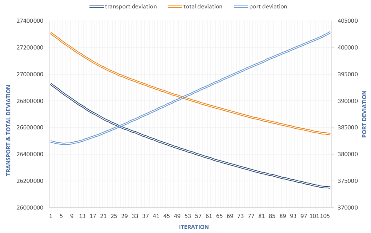Toegepast op goederenbewegingen tussen Nederland en België genereerde het model sets van geldige multimodale ketenalternatieven. Door machine learning te implementeren — met name het Expectation-Maximisation (EM)-algoritme — was het mogelijk om de verdeling van vraagaandelen over deze alternatieven te voorspellen en afwijkingen tussen voorspelde stromen en waargenomen gegevens van Eurostat succesvol te minimaliseren. Twee datasets, transportstromen en havenactiviteitsstatistieken, werden als referentiepunten gebruikt. Het model reduceerde consistent de algehele afwijking tot convergentie, wat aangeeft dat het raamwerk de best mogelijke prestaties bereikte gezien de beschikbare invoergegevens en inherente afwegingen. Dit toont aan dat de combinatie van grafiekgebaseerde padconstructie met ongeleid leren een praktische, datagestuurde aanpak biedt voor multimodale goederenvervoersmodellering.